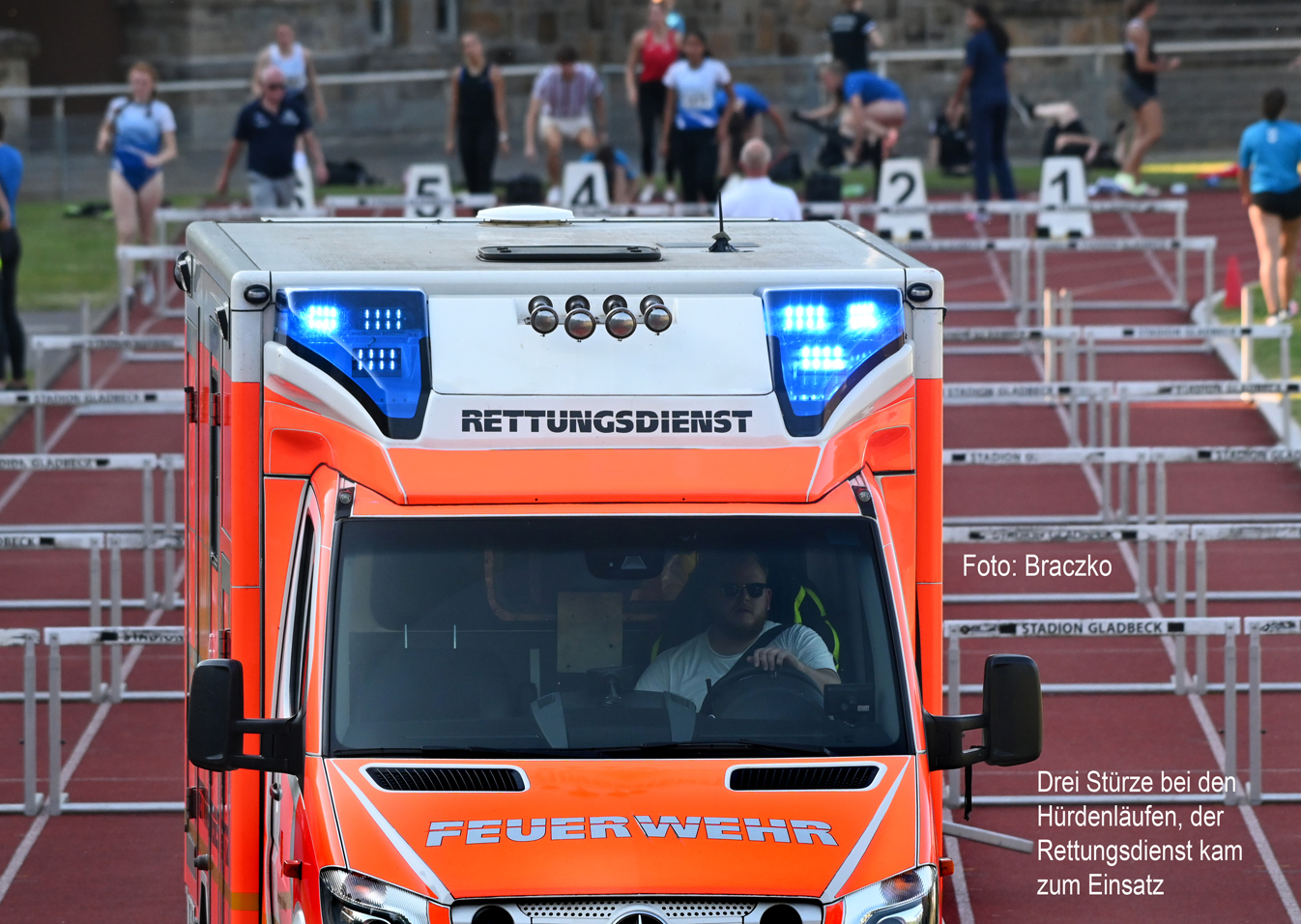 Gleich drei Stürze hintereinander überschatteten die Hürdenläufe kurz vor dem Ende der Borsig-Veranstaltung, dazu erschien bei einem Sturz die Gladbecker Feuerwehr mit RTW und Notarzt im Stadion-Innenbereich.