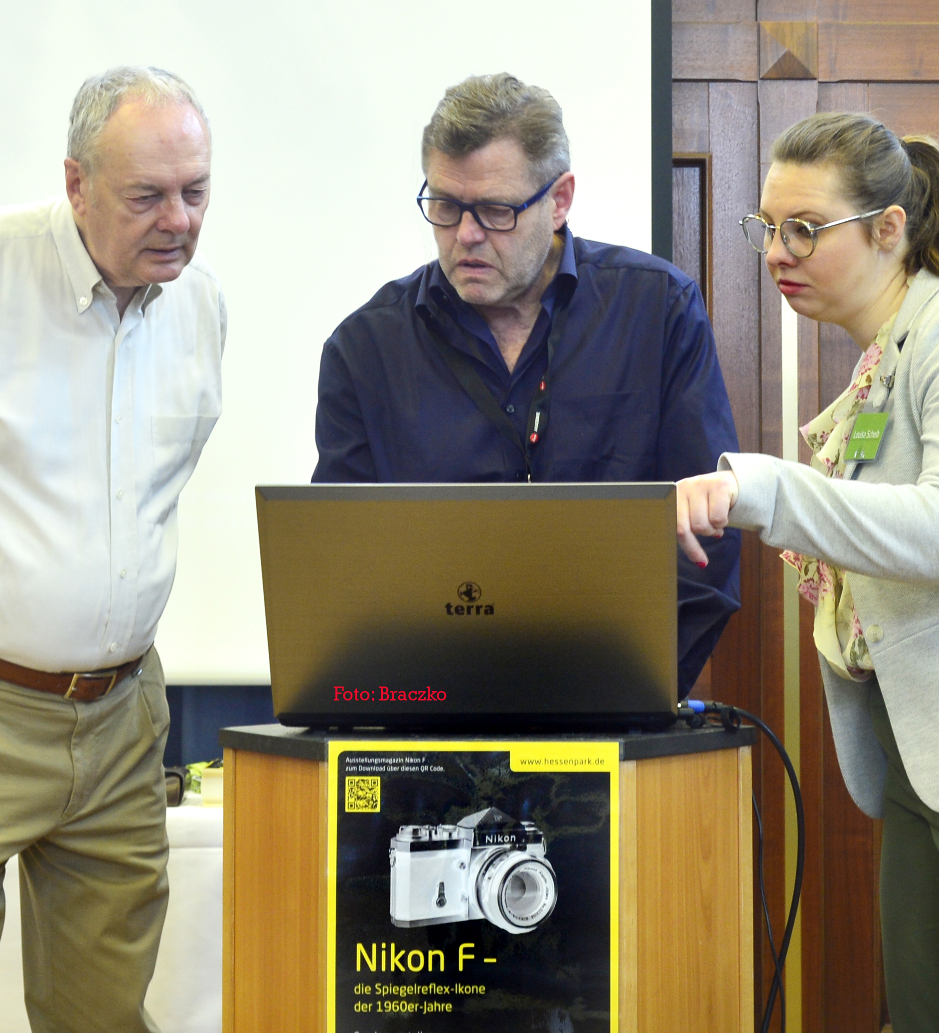 Nach der Ankunft und einem kleinen Plausch mit der Frau an der Rezeption („Was? Ihr seid aus dem Ruhrgebiet, ich bin Schalke-Fan!“) ging es aufwärts zum „Festsaal Landgraf Ludwig.“ War nahmen nach der herzlichen Begrüßung unsere Plätze in der zweiten Reihe ein und beobachteten die Eröffnungsvorbereitungen, damit waren auch gleich drei „Nikon-Ikonen“ im Saal anwesend: Die Nikon F und die Nikon-Buchautoren und Nikon-Historiker Uli Koch und Peter Braczko.