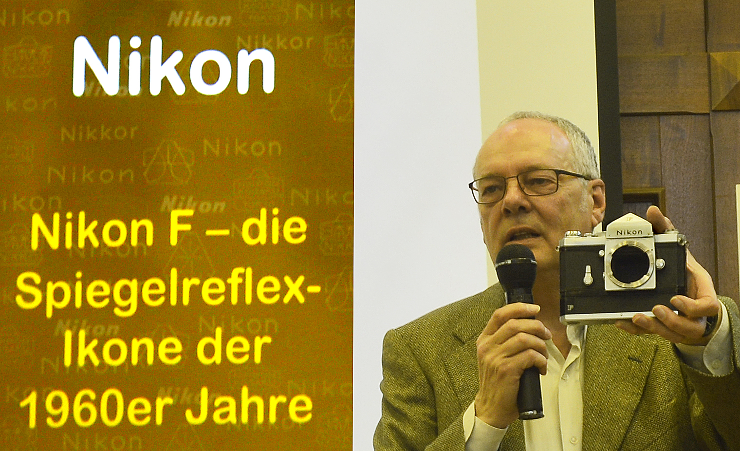 Nach der Ankunft und einem kleinen Plausch mit der Frau an der Rezeption („Was? Ihr seid aus dem Ruhrgebiet, ich bin Schalke-Fan!“) ging es aufwärts zum „Festsaal Landgraf Ludwig.“ War nahmen nach der herzlichen Begrüßung unsere Plätze in der zweiten Reihe ein und beobachteten die Eröffnungsvorbereitungen, damit waren auch gleich drei „Nikon-Ikonen“ im Saal anwesend: Die Nikon F und die Nikon-Buchautoren und Nikon-Historiker Uli Koch und Peter Braczko.