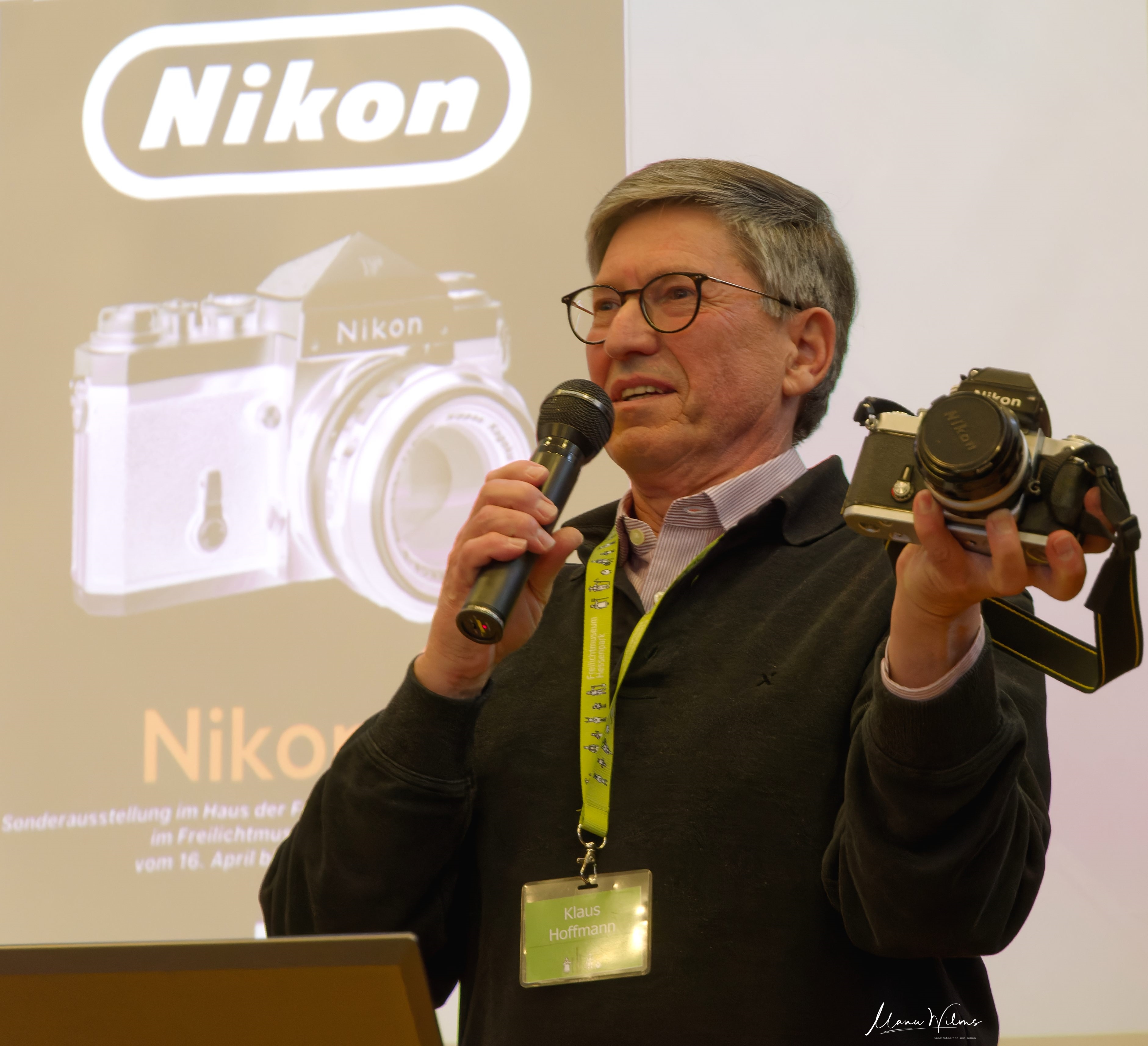 Mit Rütger Teuscher fand ein weiteres NCD-Mitglied den Weg zur Eröffnungsfeier. Schnell füllte sich der Saal, es gab bei den hundert geladenen Gästen nur fünf Absagen. Viele Besucher brachten ihre Nikon F mit oder eine andere Nikon-Kamera. Daraus entwickelten sich schon vorab viele Fachgespräche unter „Gleichgesinnten!“ Es folgte die Begrüßung durch den Museumsleiter Jens Scheller, als zweiter Redner kam Klaus Hoffmann zu Wort, gleichzeitig im Vorsitz des Förderkreises Freilichtmuseum Hessenpark e.V. Sein Grußwort und Dank ging auch an die weiteren Fördermitglieder des Vereins, denn die Planung und Umsetzung dieser Sonderausstellung in Höhe von 10.000 Euro musste erst einmal gestemmt werden.