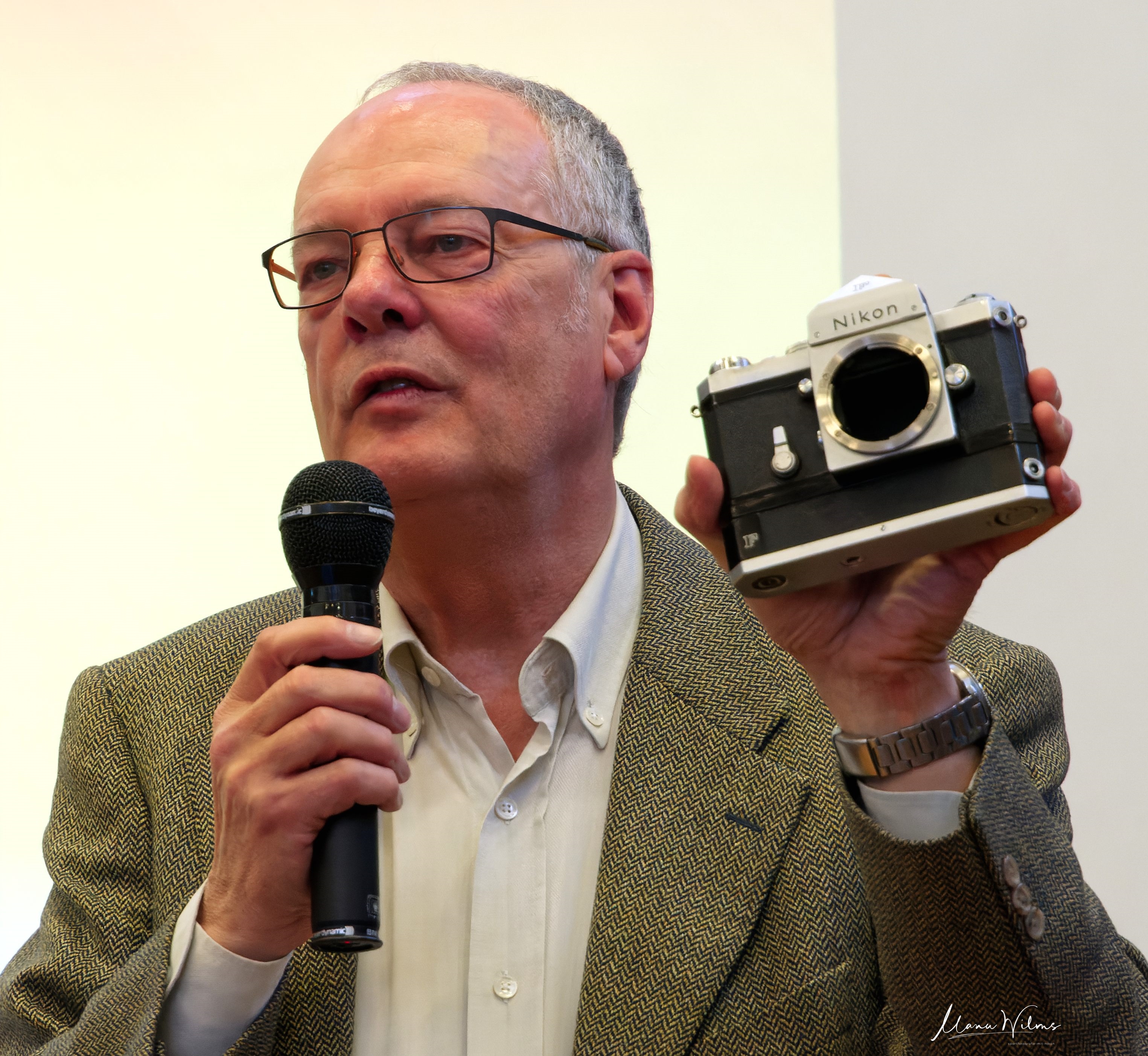 Nach der Ankunft und einem kleinen Plausch mit der Frau an der Rezeption („Was? Ihr seid aus dem Ruhrgebiet, ich bin Schalke-Fan!“) ging es aufwärts zum „Festsaal Landgraf Ludwig.“ War nahmen nach der herzlichen Begrüßung unsere Plätze in der zweiten Reihe ein und beobachteten die Eröffnungsvorbereitungen, damit waren auch gleich drei „Nikon-Ikonen“ im Saal anwesend: Die Nikon F und die Nikon-Buchautoren und Nikon-Historiker Uli Koch und Peter Braczko.