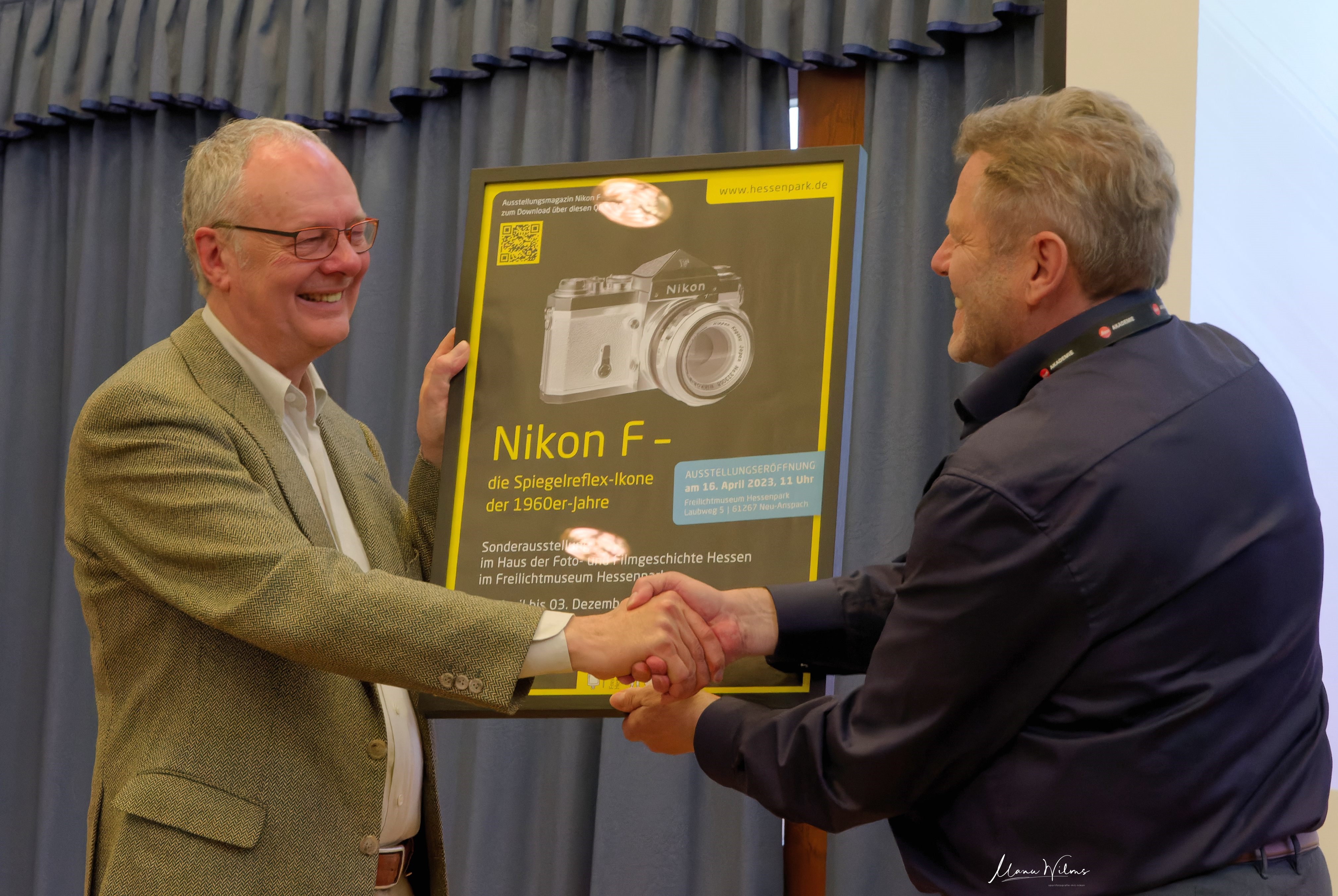 Mit Rütger Teuscher fand ein weiteres NCD-Mitglied den Weg zur Eröffnungsfeier. Schnell füllte sich der Saal, es gab bei den hundert geladenen Gästen nur fünf Absagen. Viele Besucher brachten ihre Nikon F mit oder eine andere Nikon-Kamera. Daraus entwickelten sich schon vorab viele Fachgespräche unter „Gleichgesinnten!“ Es folgte die Begrüßung durch den Museumsleiter Jens Scheller, als zweiter Redner kam Klaus Hoffmann zu Wort, gleichzeitig im Vorsitz des Förderkreises Freilichtmuseum Hessenpark e.V. Sein Grußwort und Dank ging auch an die weiteren Fördermitglieder des Vereins, denn die Planung und Umsetzung dieser Sonderausstellung in Höhe von 10.000 Euro musste erst einmal gestemmt werden.