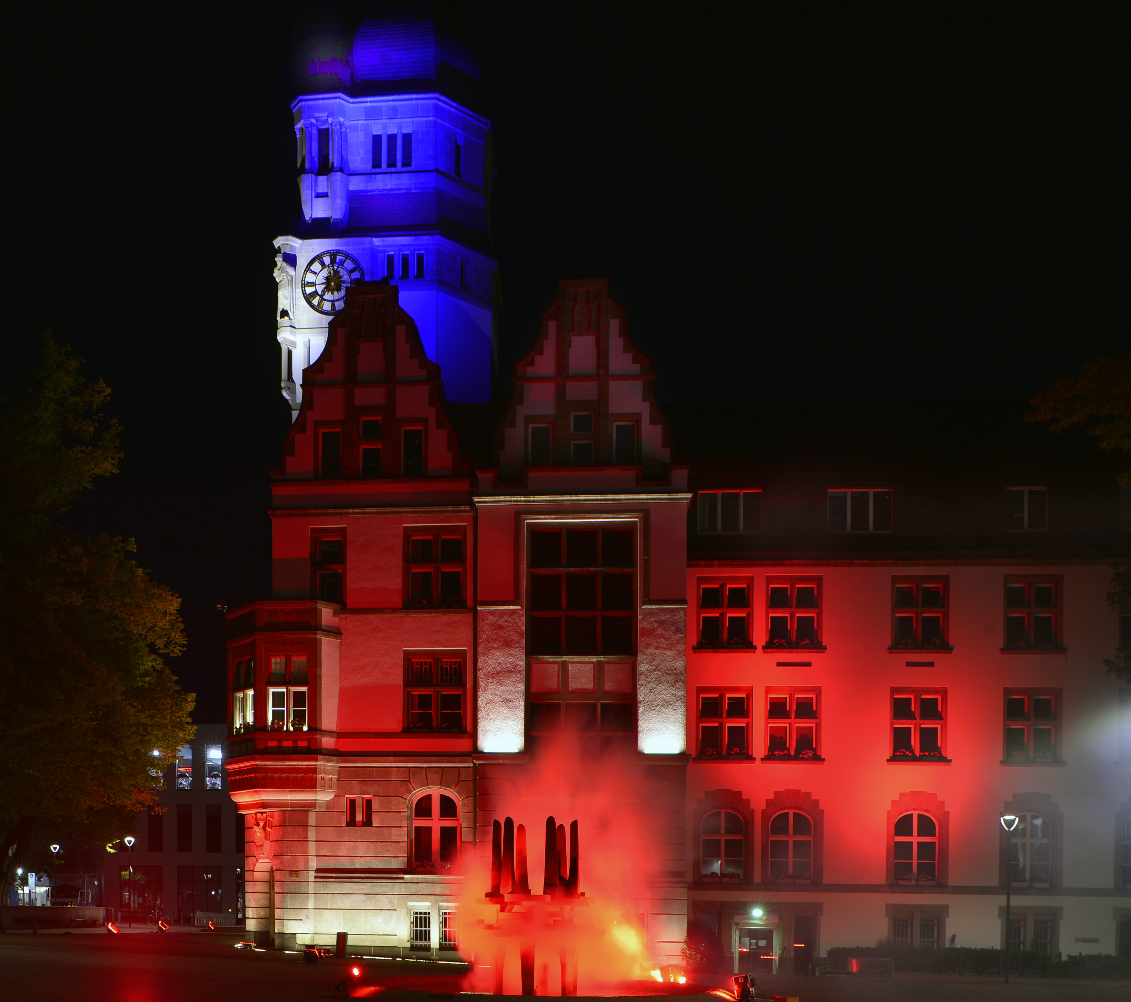 ...und noch ein "rotes Bild", es zeigt das Rathaus in Gladbeck, belichtet wieder mit der Nikon Df, aber ein anderes Objektiv ist eingesetzt, das Shift-Nikkor 4/28 mm. Daten: Blende 32, ca. acht Sekunden Belichtungszeit, beide Bilder mit Stativ. Das Shift-Nikkor gehörte übrigens einem bekannten stern- und GEO-Fotografen, der es sehr oft verwendete.