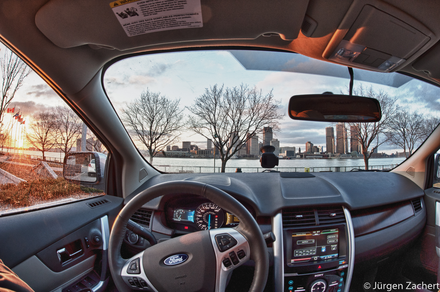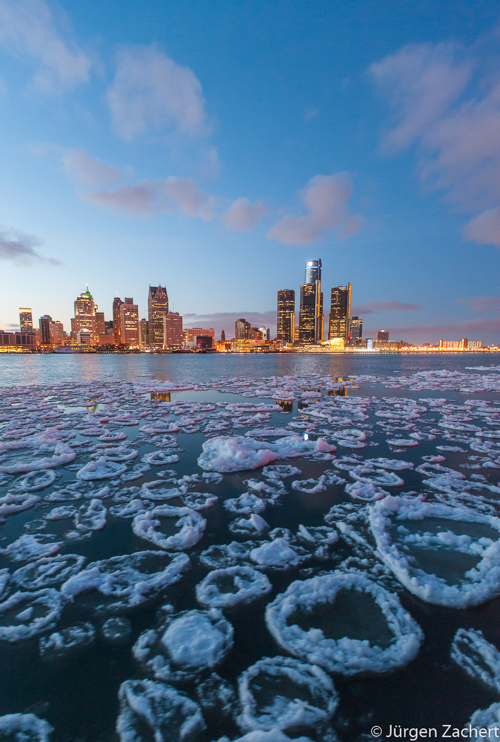 Das schöne an Fotografie als Hobby ist für mich die Möglichkeit, auch auf Dienstreisen damit besondere Motive festhalten zu können. Erstes Beispiel ist eine Reise nach Detroit, Ende März 2011. In dem Winter war es dort lange kalt und ich bin dort noch im Schnee gelandet. Die Downtown hat einen schlechten Ruf und ich war mir nicht sicher, wie ich am sichersten ein gutes Foto davon machen könnte. Auf dem Weg in ein Werk im nahen Kanada nahm ich von Detroit die große Ambassador Bridge über den Detroit River, der dort USA und Kanada voneinander trennt. Von der Brücke sah ich, dass man über den Fluß hinweg einen guten Bick auf die Downtown hat (Bild 0054) ... also gemerkt und für den Rückweg das kanadische Flußufer im Navi eingegeben. Typisch für Nordamerika kann man da schön mit dem Auto vorfahren (Bild 0329) ... zum Glück, denn es war ganz schön kalt ... Ich hab dann erst mal die Lage erkundet (Bild 0269) - mit HDR halbwegs akzeptabel aber nicht umwerfend. Schön waren die Eisschollen auf dem Fluß und gut das nahe Auto mit Sitzheizung ... ich hab dann (später Nachmittag) den Sonnenuntergang abgewartet und konnte in der blauen Stunde mein Bild der Reise machen (0391). Da sich die Eisschollen recht zügig bewegten war Langzeitbelichtung keine Option und ich habe daher aus der Hand mit 17mm (17-35mm 2.8) f4.0 1/10s und 3.200 ISO das Bild gemacht (mit der D3).