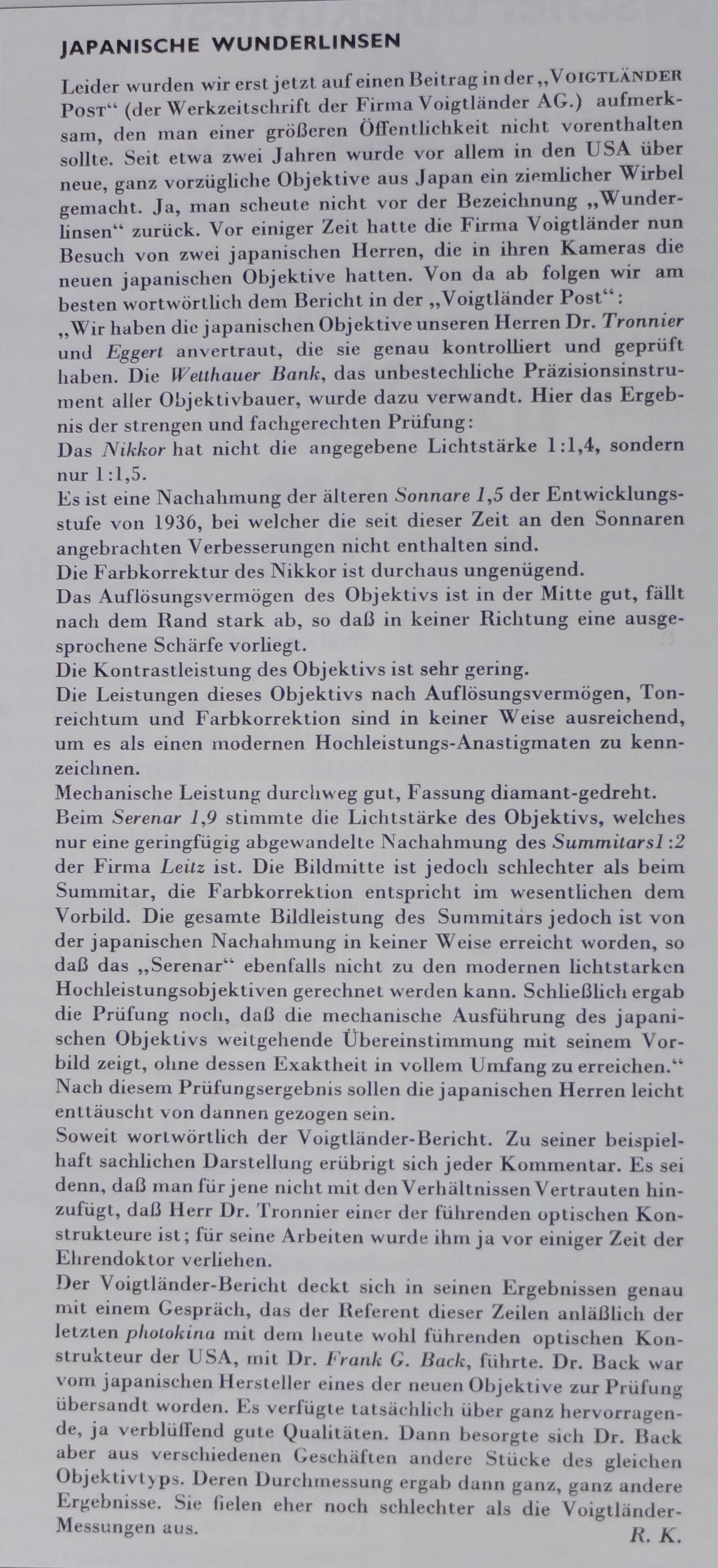 Leider, leider ist ein Fachmagazin-Beitrag über den Besuch einer kleinen japanischen Gruppe, die ihre Objektive in einem deutschen Institut testen lassen wollten, in meinem Nirwana verschwunden. Ich sehe ihn aber immer noch heute deutlich vor Augen. Selbstverständlich waren in diesem Bericht des "Fach"-Magazins vom Besuch der Japaner die deutschen Objektive den japanischen Linsen überlegen, ohne dafür im Blatt einen einzigen Beweis abzuliefern. Was den vor Schadenfreude feixenden Claqueur des Fachblatts von „begossenen Pudeln“ berichteten ließ, als die japanischen Optik-Konstrukteure enttäuscht von dannen zogen.
