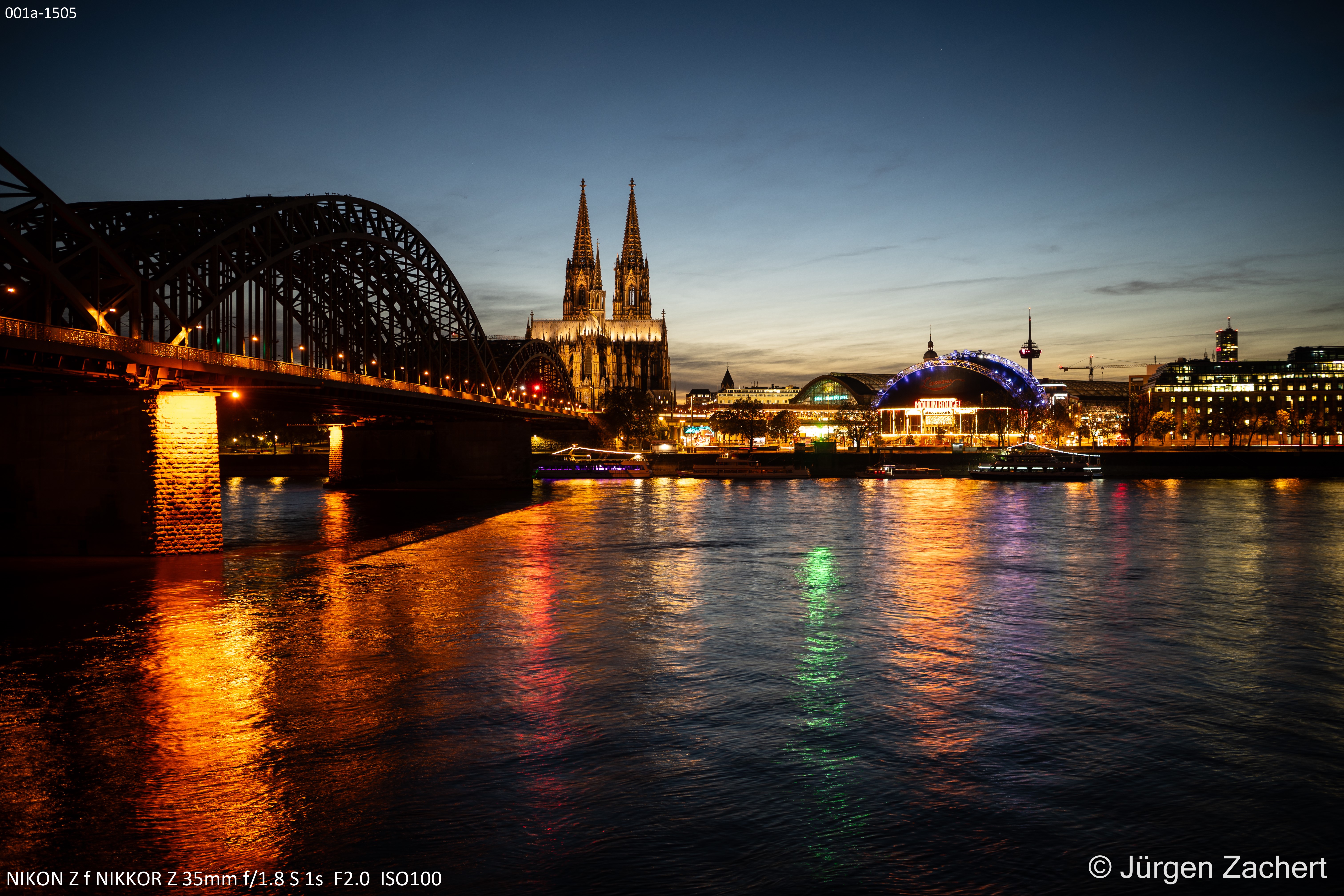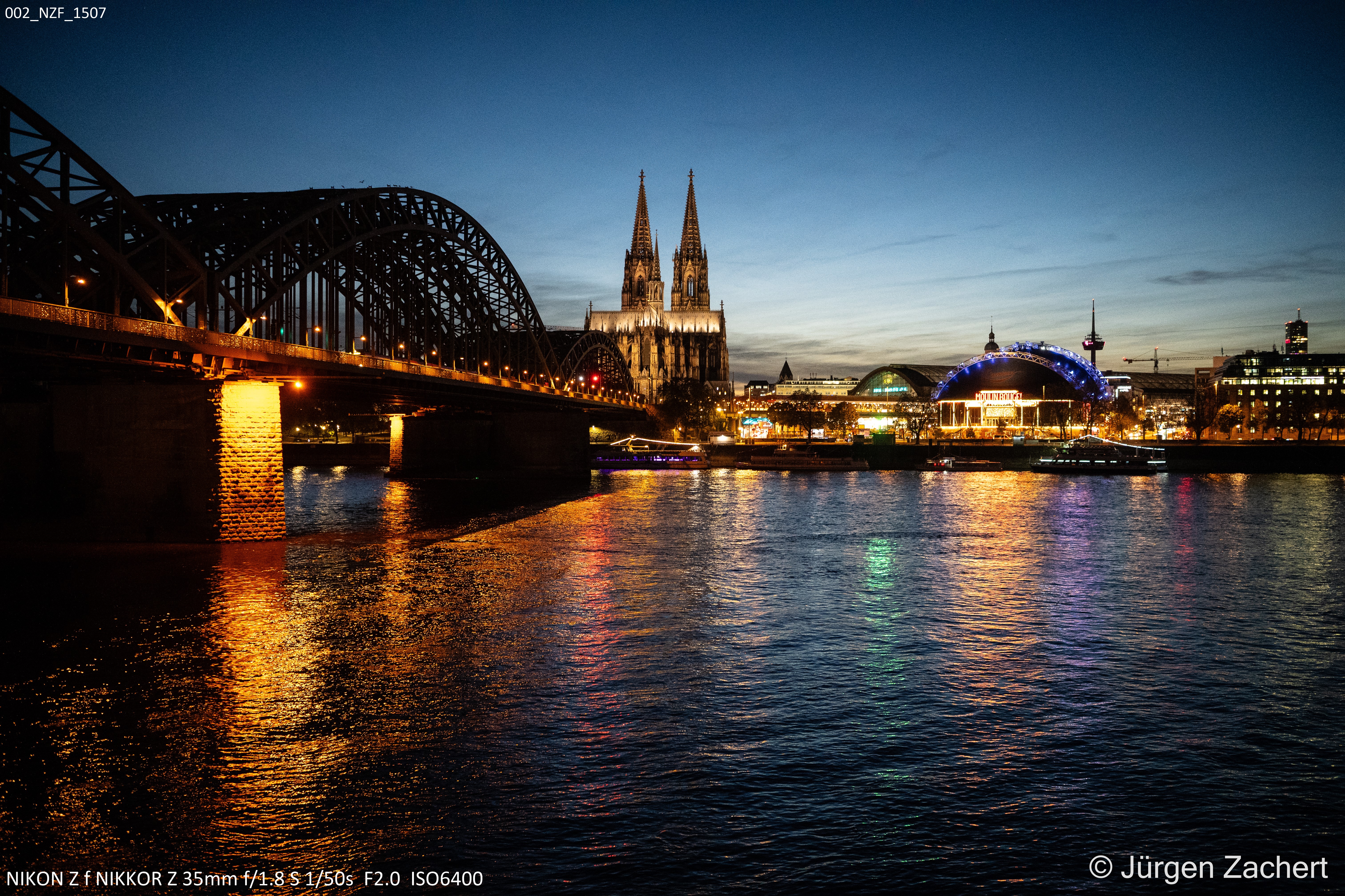 Die Nikon Zf soll ja mittels IBIS bis zu 8 Lichtwerte zusätzlich Verwackelungsschutz bieten. Also zur blauen Stunde an den Rhein und probiert ... mit 35mm f/1.8 Nikkor Z habe ich mich mutig an 1s aus der Hand gewagt ... hat geklappt (2x ohne sichtbare Verwackelung)! Zum Vergleich ein weiteres Bild mit ISO 6400 und der haltbaren 1/50s ...