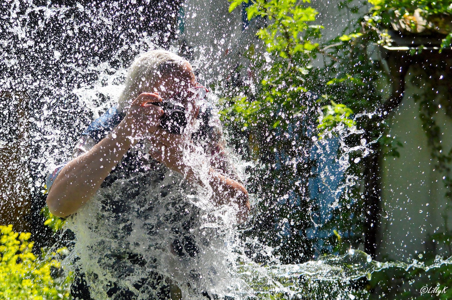 Beispiel: Die Vorgabe, dass auch Wasser dabei eine Rolle spielt. Motiv: Ein Nikon-Fotograf will gerade auf den Auslöser drücken, da fährt ein Bus durch eine Pfütze und das nasse Element trifft ihn mit voller Wucht. Blöderweise spielte ich das Modell, denn nach jeder Fotoserie waren neue und trockene Klamotten fällig. Weitere Vorgabe dabei: Eine extrem kurze Verschlusszeit.