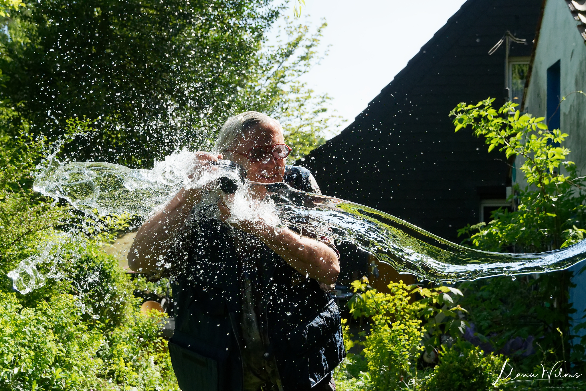 Beispiel: Die Vorgabe, dass auch Wasser dabei eine Rolle spielt. Motiv: Ein Nikon-Fotograf will gerade auf den Auslöser drücken, da fährt ein Bus durch eine Pfütze und das nasse Element trifft ihn mit voller Wucht. Blöderweise spielte ich das Modell, denn nach jeder Fotoserie waren neue und trockene Klamotten fällig. Weitere Vorgabe dabei: Eine extrem kurze Verschlusszeit.