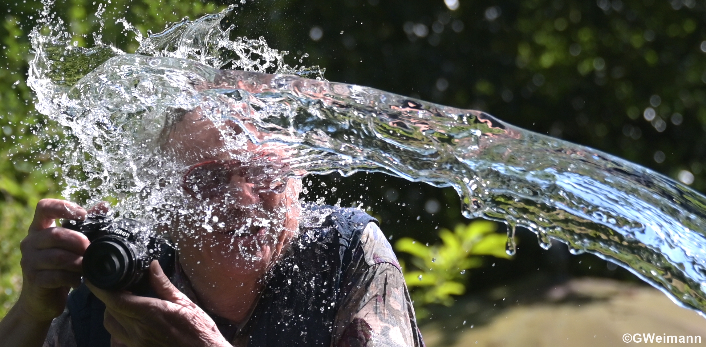 Beispiel: Die Vorgabe, dass auch Wasser dabei eine Rolle spielt. Motiv: Ein Nikon-Fotograf will gerade auf den Auslöser drücken, da fährt ein Bus durch eine Pfütze und das nasse Element trifft ihn mit voller Wucht. Blöderweise spielte ich das Modell, denn nach jeder Fotoserie waren neue und trockene Klamotten fällig. Weitere Vorgabe dabei: Eine extrem kurze Verschlusszeit.